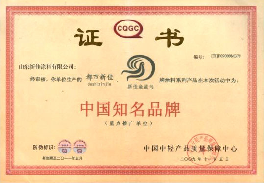 新佳涂料荣获中国知名品牌称号