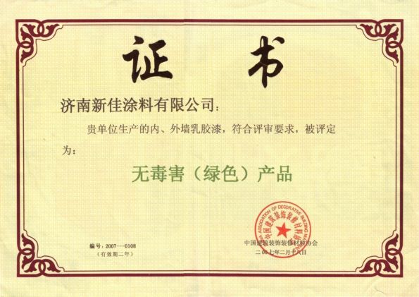 新佳涂料荣获无毒害绿色建材称号
