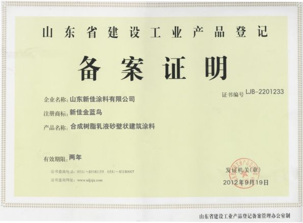 山东省建设工业品备案证 内墙系列